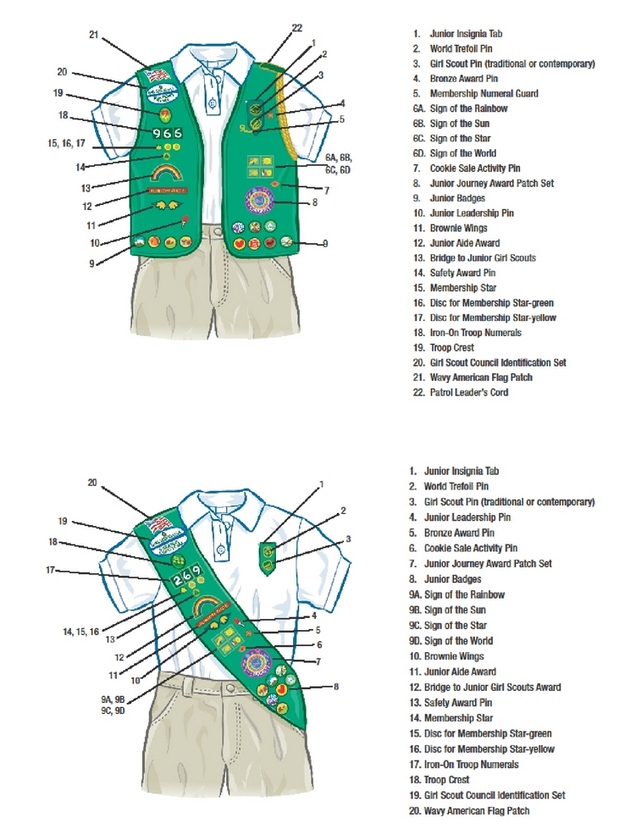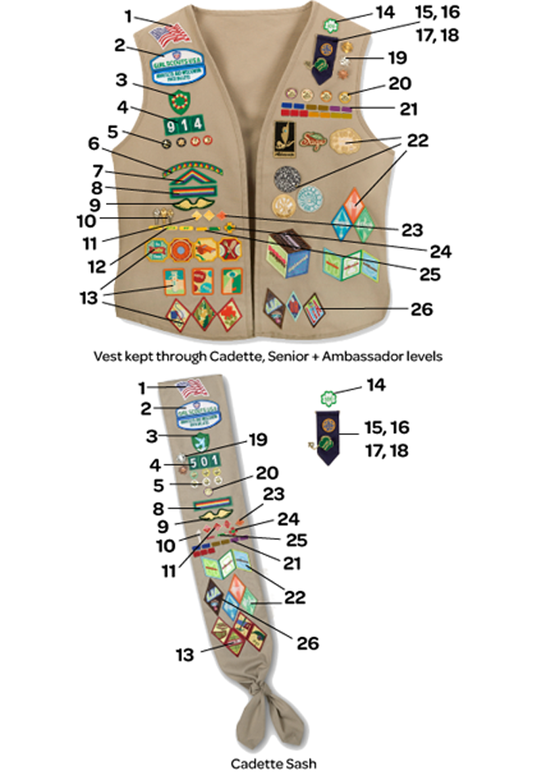 Cadettes, Seniors and Ambassadors may start new vests or sashes as they bridge to new grade levels, or they may continue using their existing one. Seniors and Ambassadors may also wear their official scarf.